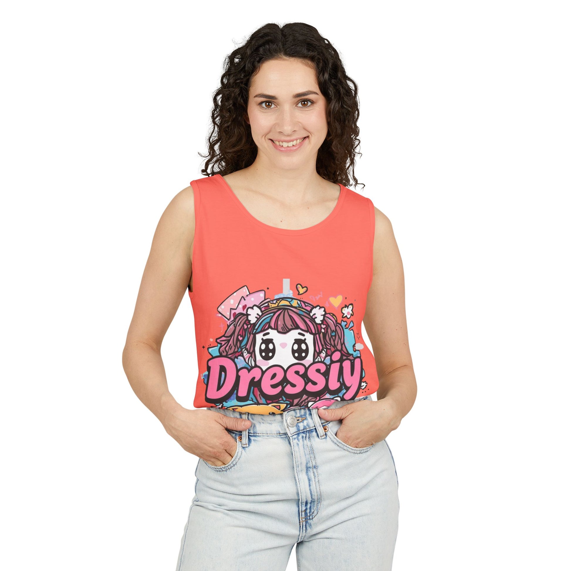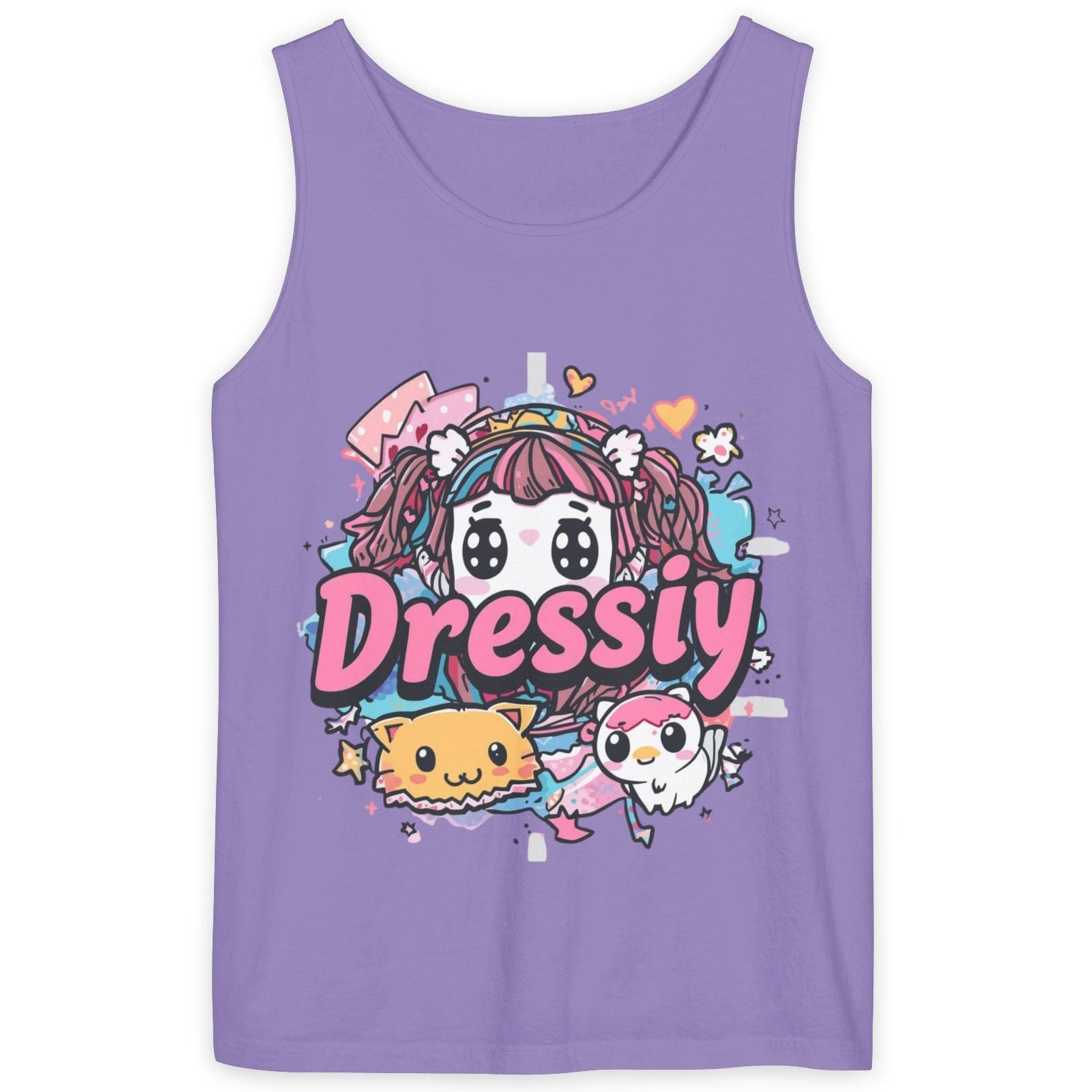 This soft garment-dyed tank brings playful kawaii energy to everyday wear. The illustrated centerpiece shows a wide-eyed character surrounded by pastel hearts, bows, and two cheerful companions — a squishy toast and a tiny unicorn — rendered in candy-pink, baby-blue, and warm yellow. The relaxed fit and medium-weight ringspun cotton drape gently, making it easy to layer under cardigans or wear solo on warm days. Wear it to conventions, casual meetups, or cozy at-home streaming sessions and feel cute, comfortable, and a little bit whimsical every time you pull it on.