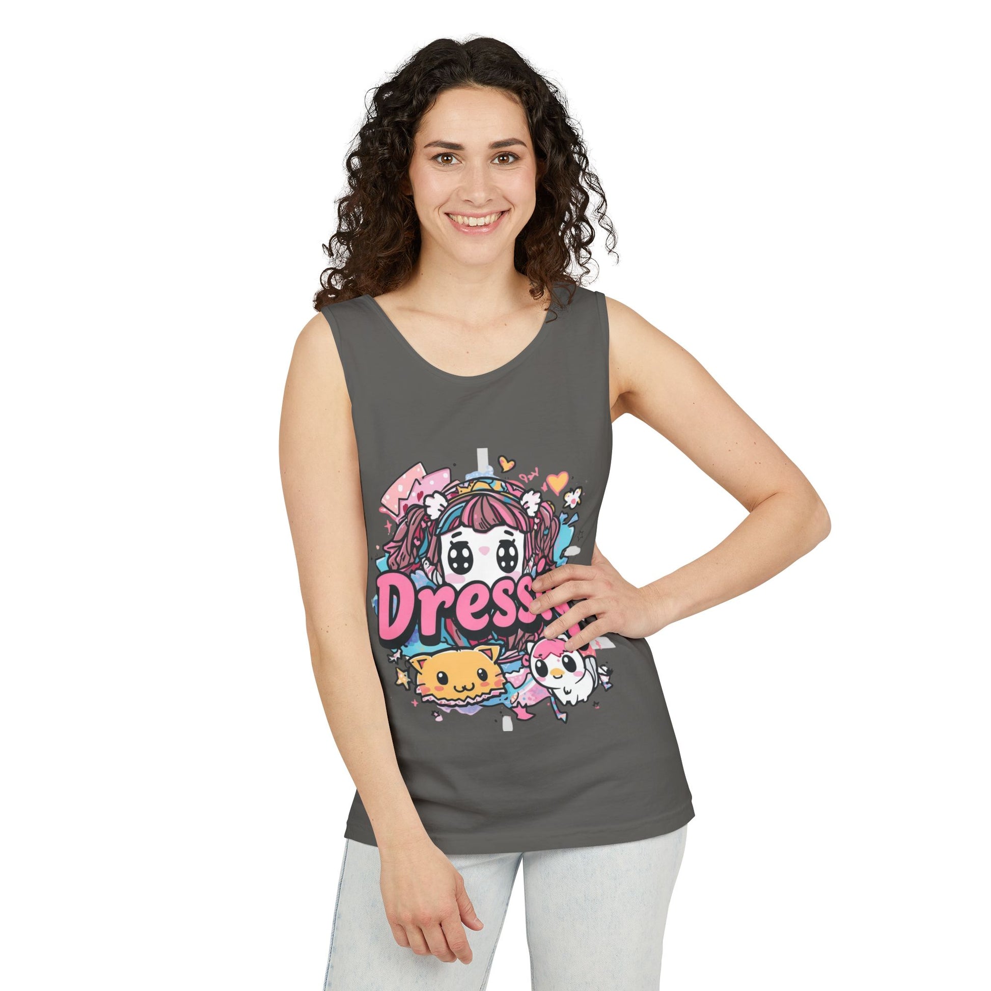 Cute and playful kawaii tank top featuring an anime girl and mascot graphic. Made from lightweight, breathable fabric for comfortable summer wear. Perfect for casual outfits, street style, or anime lovers who enjoy fun and adorable designs. Ideal for daily wear, vacations, or pairing with shorts and skirts for a trendy look.